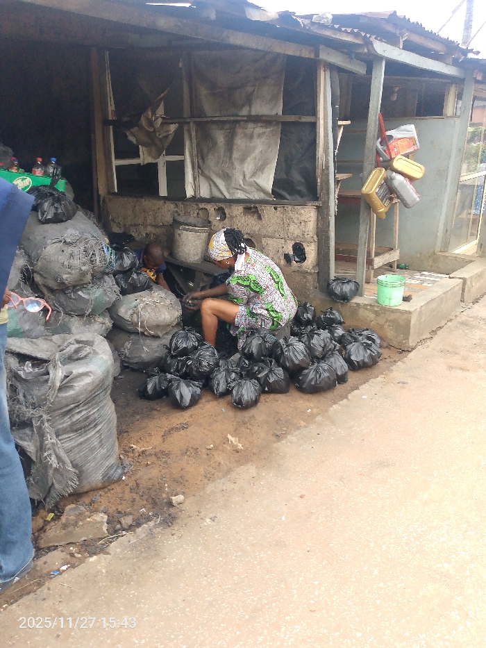 The image depicts an outdoor vendor stall in Lagos, Nigeria. The scene is dominated by a woman and a child engaging with goods in front of a rudimentary structure. **Structure and Environment:** A single-story, open-fronted structure constructed from concrete blocks and wooden supports is visible. The roof is corrugated metal sheeting. The interior of the stall is dark, with openings covered by grey and black fabric or tarpaulin. On the right exterior wall, several empty plastic containers, predominantly yellow and grey jerry cans, are hung from a wooden beam. A light green plastic bucket rests on a low concrete platform to the right of the stall entrance. The ground in front of the stall consists of packed dirt and debris, transitioning to a lighter-colored concrete or paved surface in the foreground. **People and Actions:** A dark-skinned woman, wearing a patterned green, white, yellow, and black dress and a yellow and white headscarf, is seated on a low wooden bench inside the stall's opening. She is bent forward, actively handling numerous small, black plastic bags, which are tied shut and arranged on the dirt ground in front of her. To her left, partially obscured by a stack of large bags, a small child wearing a blue top is visible, also interacting with items on the ground. On the far left, the lower torso and legs of another individual, wearing blue jeans, are partially visible. A pair of pink-framed glasses hangs near this person's hip. **Objects and Materials:** To the left of the woman, a substantial pile of large, grey, woven sacks (possibly hessian or polypropylene) is stacked. These sacks appear to be filled with a dark, granular material, likely charcoal. The small black plastic bags being handled by the woman also contain this material, indicating individual portions for sale. Scattered debris and remnants of the dark material are visible on the dirt ground. **Timestamp:** A digital timestamp "2025/11/27 15:43" is imprinted on the lower left corner of the image.