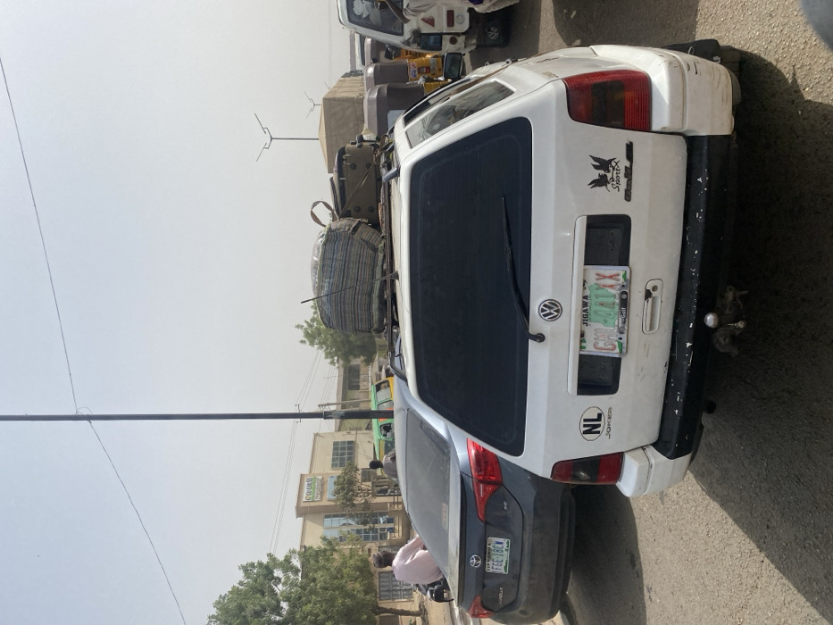 The scene depicts a congested street in Gobirawa, Nigeria, under a hazy daylight sky. In the foreground, a white Volkswagen Golf station wagon is observed from the rear, displaying a Jigawa state license plate "GH 404 XX". The vehicle has dark-tinted rear windows, "NL" and "Joker" stickers to the left of the license plate, and a "SportX" decal with a winged creature on the right. A prominent roof rack carries a striped fabric bag and a green hard-shell case, among other indistinct items. A trailer hitch is visible below the rear bumper. Directly behind the white Volkswagen is a dark grey Toyota Corolla sedan, bearing a Jigawa state license plate "FGE 18CW". A person in a light-colored shirt is seated on a motorcycle positioned behind the Toyota Corolla, facing away from the camera. To the right, a queue of vehicles includes multiple yellow and black commercial tricycles. On the left side of the frame, a green small bus or van is partially visible. In the background on the left, a multi-story building with "CRONIL Hotel" visible on its facade stands amidst sparse trees. A tall, dark utility pole occupies the mid-ground, with power lines traversing the upper portion of the frame. Distinctive streetlights with horizontal cross-arms are visible in the distant background on the right.
