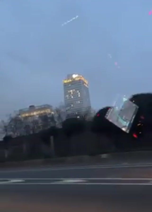 view from inside a moving vehicle, likely a car, at dusk or early evening. The foreground consists of the road, a concrete barrier, and the side mirror of the vehicle. In the background, two tall buildings are visible, illuminated with lights. The sky is overcast and pale blue. Other cars are moving on the road. The video appears to be taken during transit, as the buildings and road move past the camera.