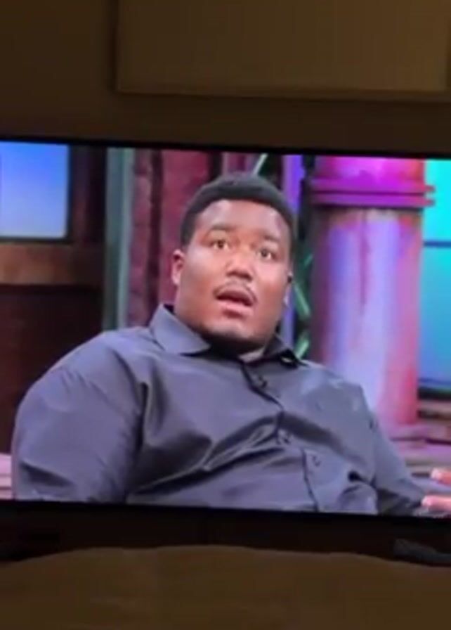 television screen with two men in a television studio. The man on the left is an older white male wearing a suit and holding a green piece of paper. The man on the right is a younger, Black male wearing a button-down shirt and sitting in a chair. The background is a colorful, stylized cityscape with a door. The television is sitting on what appears to be a bed. There is a framed picture on the wall above the television. The younger man is talking.