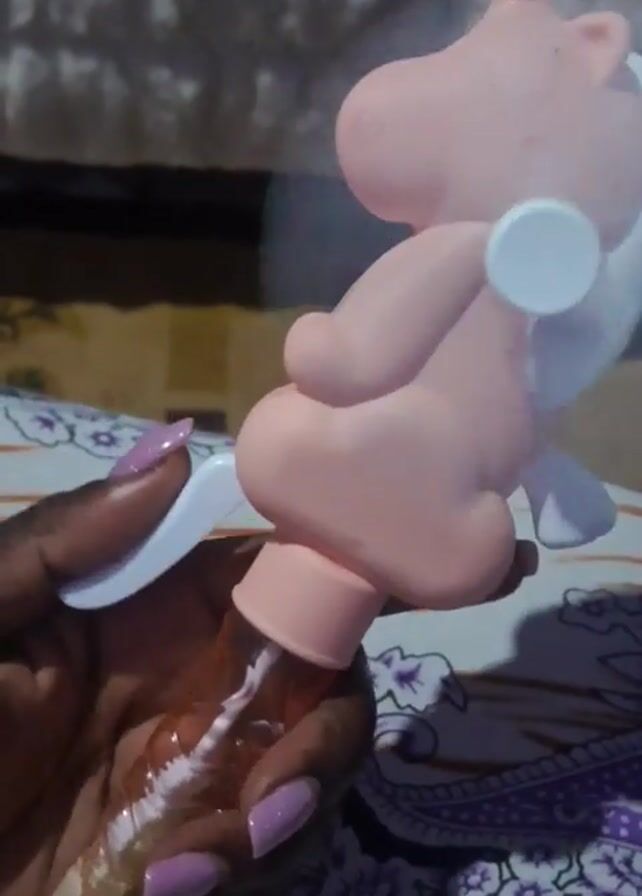 A person with pink manicured nails is holding a small, battery-powered, pink and white unicorn fan. The fan is turned on, and the blades are spinning. The bottom of the fan is attached to a clear plastic tube containing a yellow liquid, possibly oil. The background is a bed with a white and purple patterned sheet.