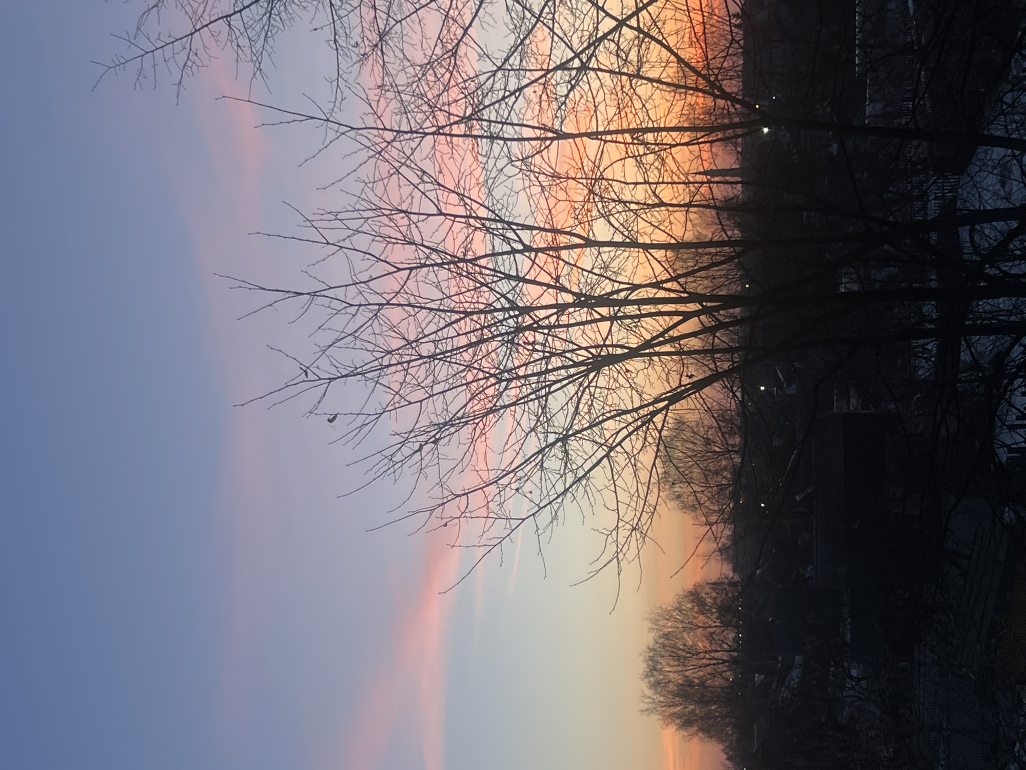 The image depicts a sunset sky over Kazan, Russia. Silhouetted bare tree branches dominate the foreground, obscuring a dark, indistinct cityscape below. The sky transitions from blue to pink to orange, indicative of twilight conditions. No people are visible. A faint contrail is discernible in the pink sky area.