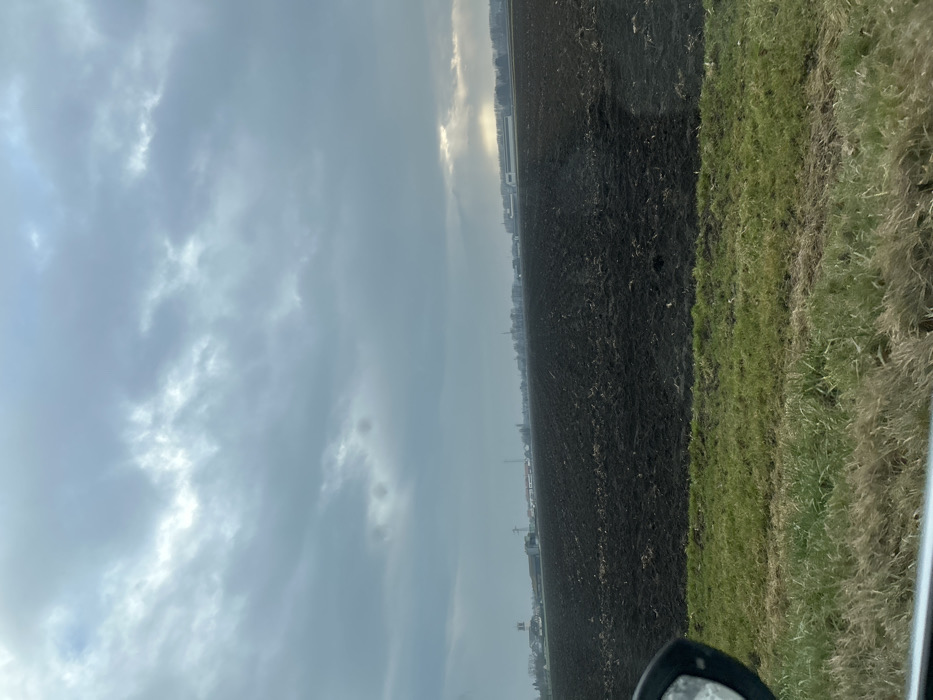 The image depicts a rural landscape in La Wantzenau, France, under an overcast sky. In the immediate foreground, the lower-left corner is partially obscured by the black frame of a vehicle's side mirror. Below the horizon, a strip of green and dry brown grass runs horizontally across the lower portion of the frame. Beyond this, a vast expanse of dark brown, tilled agricultural field dominates the midground, showing visible furrows and disturbed soil. On the distant horizon, a line of structures is visible, including a church spire with a white building to its left, multiple commercial or residential buildings, and several utility poles or towers. A highway or major road runs horizontally across the background, featuring several vehicles, including a large white truck moving from left to right. The sky is largely covered with grey clouds, but a prominent patch of sunlight breaks through on the far right, illuminating a section of the horizon and casting a brighter glow on some distant elements. No discernible individuals or specific interactions are present.