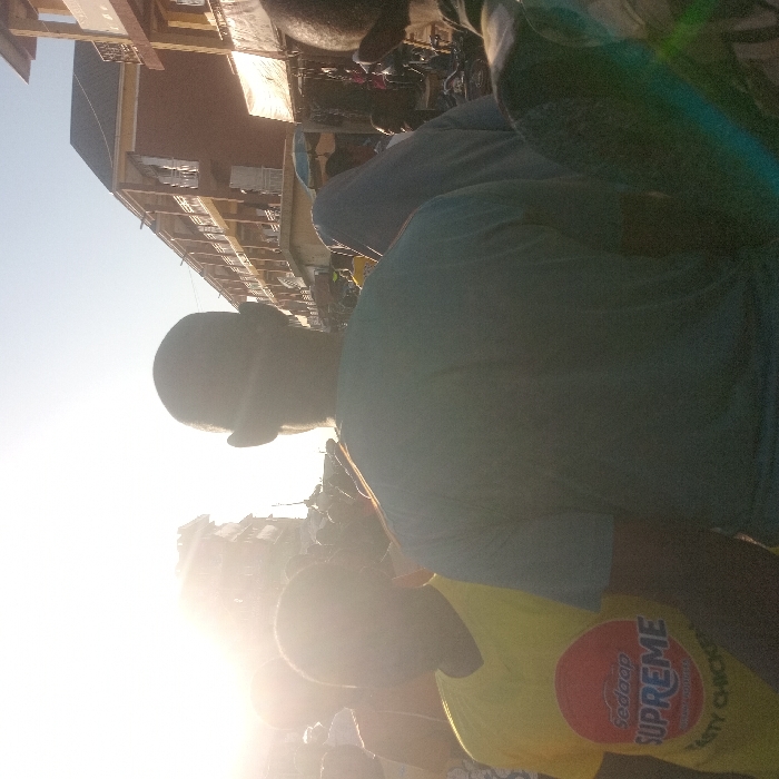 The image presents a crowded outdoor street or market scene in the city of Maiburiji, Nigeria, under bright daylight conditions with significant sun glare originating from the upper left. A male individual in a light-colored, short-sleeved shirt is prominently featured from behind in the central foreground. To his left, a younger person is partially visible, wearing a yellow t-shirt adorned with a red circular logo displaying "Sedaap SUPREME TASTY CHICKEN FLAVOUR." To the right of the central figure, another individual is observed from behind, dressed in a light-colored, possibly hooded, garment. Indistinct human figures are visible throughout the middle and background, indicating a dense gathering. Architectural elements on the right include a multi-story, red-brick building with visible balconies, and another structure suggesting urban development. An awning or tarp structure is present near the buildings on the right. A prominent blue-green lens flare is visible in the lower right portion of the image.