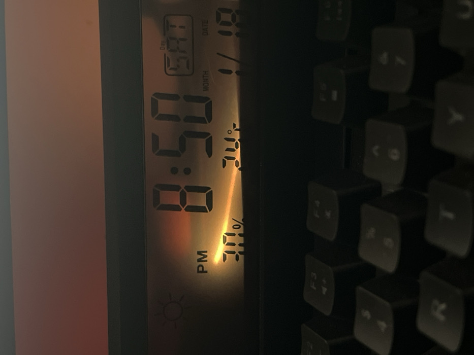 An illuminated digital clock displays "8:50" with "PM" below, showing a humidity level of "30%." The clock also indicates "10" for the date. The day is marked above the time. The ambient temperature on the clock shows 74 degrees. To the right, a portion of a keyboard is visible, its keys marked with letters such as "R," "T," "<," and "C" amidst shadows.
