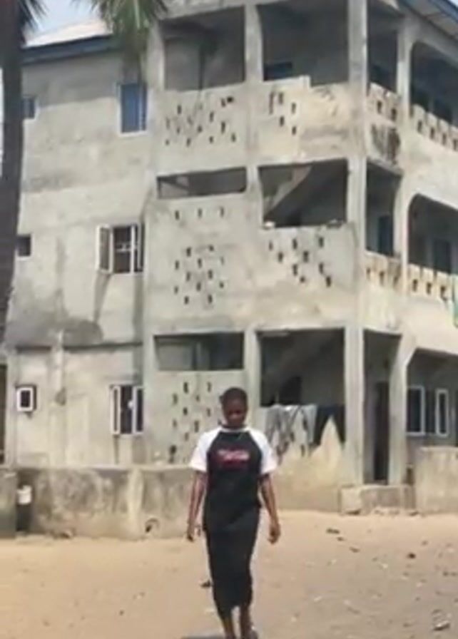 A young woman walks toward the camera across a sandy area. She is wearing a black dress, a white t-shirt with black sleeves and a graphic print, and sandals. Behind her is a concrete three-story building with several windows and openings, some clothes hanging on a line, and a water tank on the roof. There is a tall palm tree to the left of the building. The area appears to be a residential street. The sky is overcast.