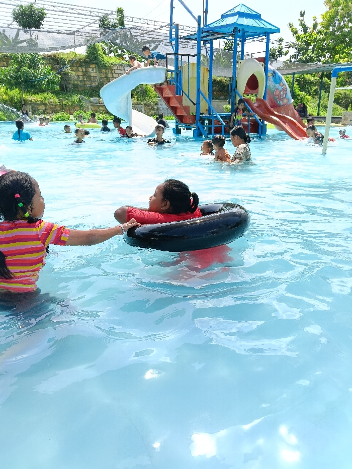 A group of children swim in a pool at a water park. Two young girls are in the foreground, one with a striped shirt helping a child in a black inner tube. In the background, other kids are enjoying the water, and a water slide structure adds to the fun. The sunny sky suggests a warm day for outdoor activities.