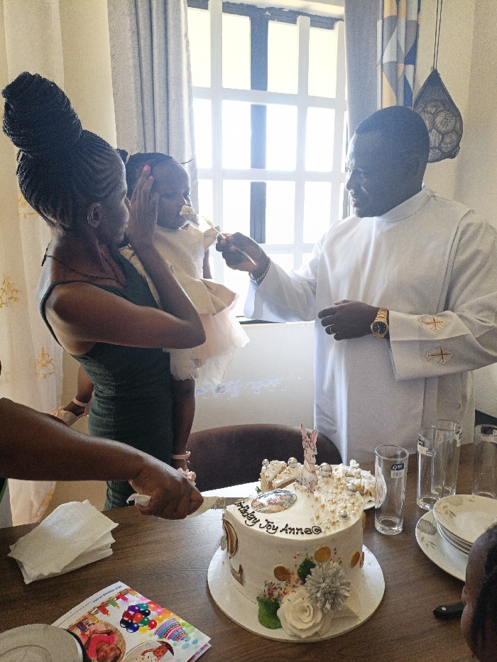 The image captures an indoor scene, likely a birthday celebration, within a domestic setting. The precise location within Kisumu, Kenya, is not identifiable from the visual information provided. In the center, a dark-skinned woman with braided hair in a bun, wearing a dark green ribbed sleeveless top, holds a young dark-skinned child. The child wears a light-colored, possibly pink, ruffled dress and a light-colored bracelet on her left wrist. To the right, a dark-skinned man, dressed in a white long-sleeved garment resembling a clerical shirt with embroidered cross symbols on the cuffs, is feeding the child a piece of cake using a small gold-colored fork. He wears a gold watch on his left wrist and a silver-colored bracelet on his right. In the foreground, a white-frosted round cake inscribed with "Happy Birthday Joy Anna" is positioned on a dark wooden table. The cake is decorated with gold and silver spheres, white and gray floral elements, and a small unicorn figurine. A dark-skinned arm and hand, belonging to an unseen individual, are visible on the lower left, cutting a slice from the cake with a serrated knife. Adjacent to the cake on the table are a colorful printed booklet depicting balloons and children, several clear drinking glasses, and a stack of white plates with a patterned rim. The top of a dark-haired child's head is partially visible in the lower right corner. The background features a large multi-paned window, admitting bright natural light, partially obscured by light-colored curtains with gold embroidery. A woven decorative item hangs on the wall to the right of the window. The walls are light-colored.