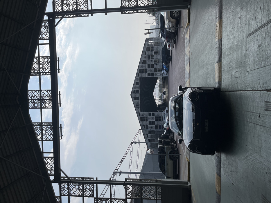 A black car is parked on a concrete surface, possibly a parking lot or loading area. The view is partly obstructed by a decorative overhead structure. In the background, there's an angular building facade with a patterned exterior. Several other vehicles are visible in the distance, parked behind the black car. The sky is overcast, suggesting a hazy or cloudy day. Metal scaffolding and patterned roof elements frame the scene.
