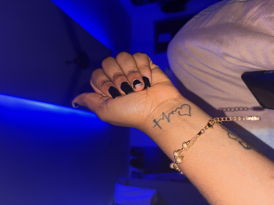 The image displays a close-up view of a dark-skinned left hand and forearm in an indoor setting in Abuja, Nigeria. The hand is positioned with the thumb extended upwards in a "thumbs up" gesture. The fingernails are painted black, with some chipped areas evident. On the inner wrist, a tattoo depicts a cross, an electrocardiogram (ECG) heartbeat waveform, and a heart symbol. A multi-strand gold-toned bracelet with light-colored spherical beads is worn on the wrist. A second tattoo is partially visible on the lower forearm. Below the arm, a light-colored fabric, possibly clothing or a blanket, is visible, on which a black smartphone rests. The background features a ceiling with recessed blue LED strip lighting, which illuminates the room with a dominant blue cast. A dark-colored ceiling fan is faintly visible in the blurred background.