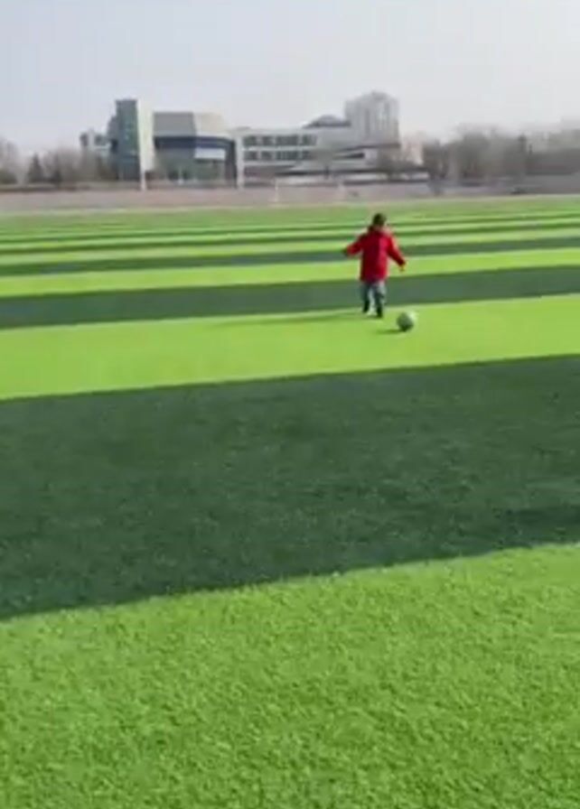 Here's a detailed description of the video: The video shows two individuals playing soccer on a green artificial turf field. Initially, an adult man wearing a white sweatshirt and blue shorts is seen kicking the soccer ball. Then the video shifts to a child wearing a red jacket dribbling the ball on the same field. Later, the adult man in the white sweatshirt kicks the ball again. The field has white lines marking it as a soccer field. In the background, there are stadium seating structures, buildings, and a tall television tower. The sky is bright, suggesting it is daytime, and the overall environment appears to be a sunny outdoor sports facility.