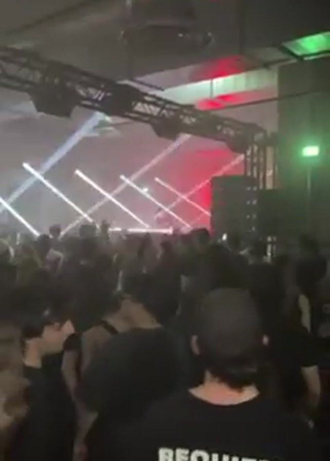 The video depicts a crowded rave, with people dancing in a dimly lit, warehouse-like space