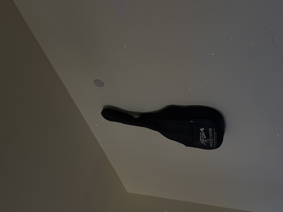 A black guitar case sits against a backdrop of a light-colored ceiling with scattered green dots. The guitar case has the text "MEGA Music CENTER" printed on it in white. A recessed light is also visible on the ceiling. The image is taken from a low angle, giving a perspective of looking up at the ceiling.