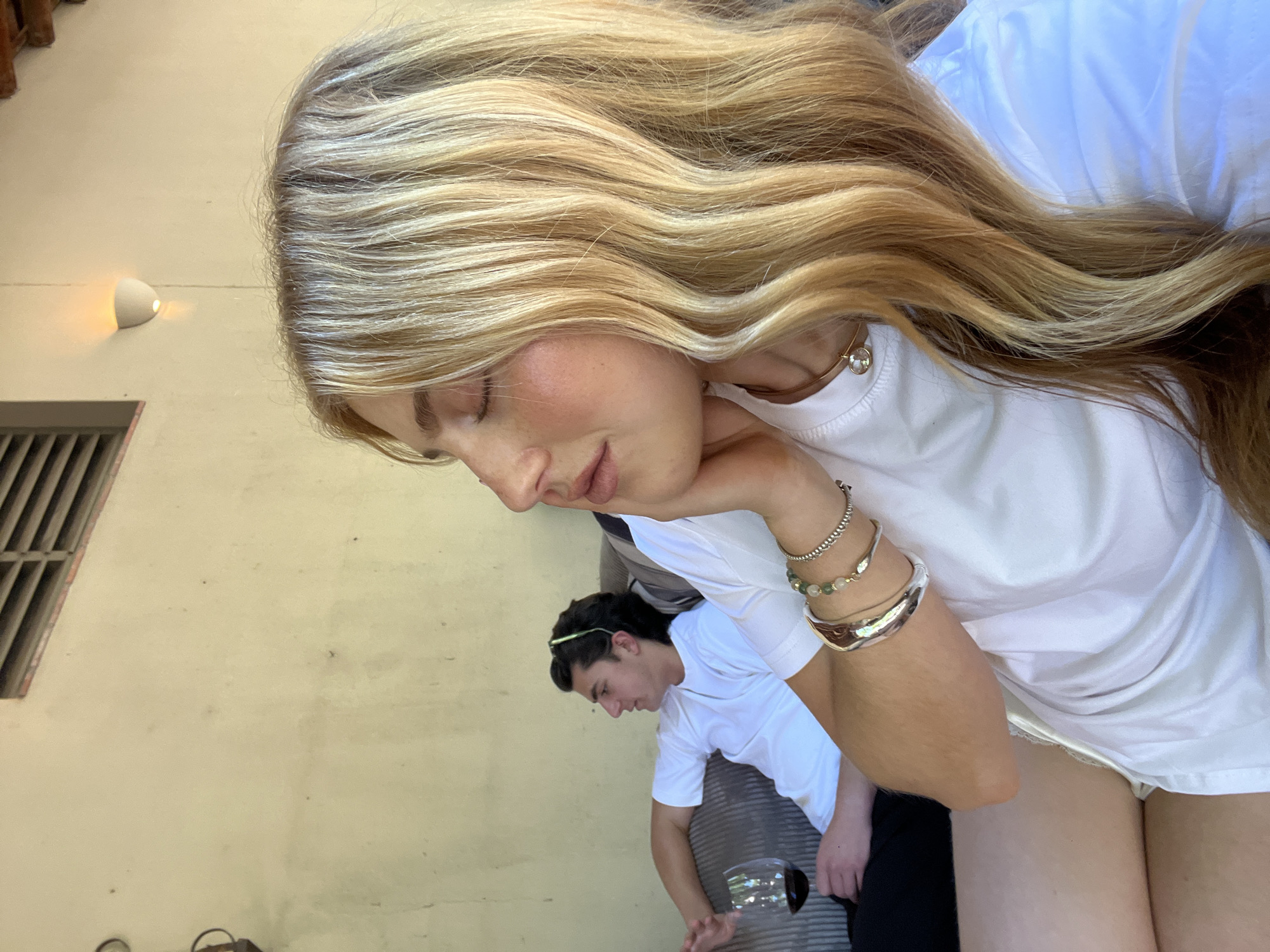 The scene is set outdoors, likely in Stellenbosch, South Africa. A fair-skinned, blonde woman wearing a white t-shirt is in the foreground, her face resting on her hand. She is wearing multiple bracelets on her wrist. In the background, a person with dark hair, also wearing a white t-shirt, is seated. A glass is visible near the seated person. The background features a light-colored wall with a vent and a wall sconce.