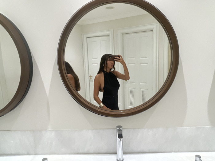 A female individual is captured in a mirror selfie within what appears to be a modern restroom. The central focus is a circular mirror with a dark brown frame, reflecting the subject holding a dark-colored smartphone with her right hand to take the photograph. She is wearing a black halter-neck top and a gold cuff bracelet on her left wrist, with long dark hair. Gold hoop earrings are also visible. In the mirror's reflection, two white paneled doors, one with a vent, and gold door handles are visible in the background. The restroom environment features white or off-white walls, a white marble or marble-effect countertop beneath the mirrors, and at least two chrome-finished, modern design faucets. A second, partially visible circular mirror with a matching frame is positioned to the left of the main mirror. The exact location within Vila Nova de Gaia, Portugal, cannot be determined from the provided image.