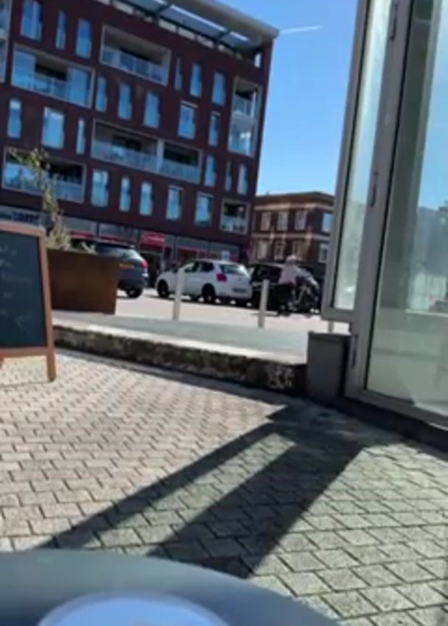 cup of coffee on a table in the foreground with a view of a street and buildings in the background on a sunny day. The cup is white and sits on a saucer. Behind the table, the ground is paved with gray bricks. A chalkboard menu board is visible to the left. Across the street, there is a modern brick building with many windows. A few cars are parked along the street. A person on a bicycle rides past. A glass structure is to the right of the frame. The sky is clear and blue with a contrail visible.