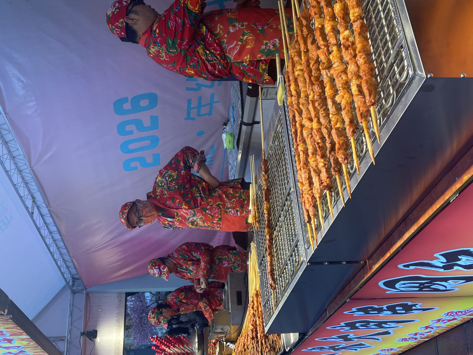 The scene depicts an active outdoor food stall in Shapingba District, China, under a white tented canopy illuminated by artificial light, suggesting evening hours. Four individuals, identified as vendors, are positioned behind a stainless steel counter. All vendors wear matching red shirts, caps, and aprons with a distinctive colorful floral pattern. The central vendor, a male wearing glasses and a floral face mask, stands with his hands on his hips, observing the operation. To his left, two female vendors are actively engaged in food preparation: one operates near a deep fryer beside a prominent display of red candied haw skewers (tanghulu), and the other prepares items on a flat surface. A fourth vendor is partially visible on the far right, also involved in food preparation. The primary offerings are numerous skewers of seasoned, grilled meat (kabobs), arranged in neat rows on two large, rectangular stainless steel grills that dominate the foreground of the counter. The front of the counter features an illuminated sign with Chinese characters in white and yellow against a red background. In the background, a large, light-pink banner displays the prominent blue numbers "2026" alongside additional Chinese text. A small packet of tissues rests on the counter surface to the right of the central vendor.