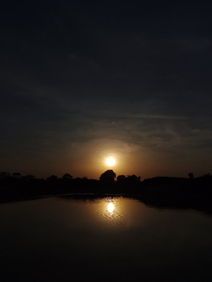 The image depicts a tranquil sunset or sunrise scene over a body of water in Narayi, Nigeria. A bright, circular orange sun is positioned low on the horizon, slightly to the right of the frame's center. Its light emanates across the sky, transitioning from dark blue-grey at the top to a warm orange-yellow near the horizon, with faint cloud formations visible. The sun's intense glow is mirrored directly below it on the water's surface, creating an elongated, shimmering reflection with visible ripples. The immediate horizon is characterized by dark silhouettes: a line of trees, including a prominent dense tree directly beneath the sun, and a small structure with a distinct roofline visible on the far left. A dark, undulating landmass, possibly a hill, is present on the right side of the horizon. The foreground consists entirely of the calm, dark body of water, which reflects the minimal ambient light from the sky and the bright solar disc. No people or active interactions are visible within the frame.