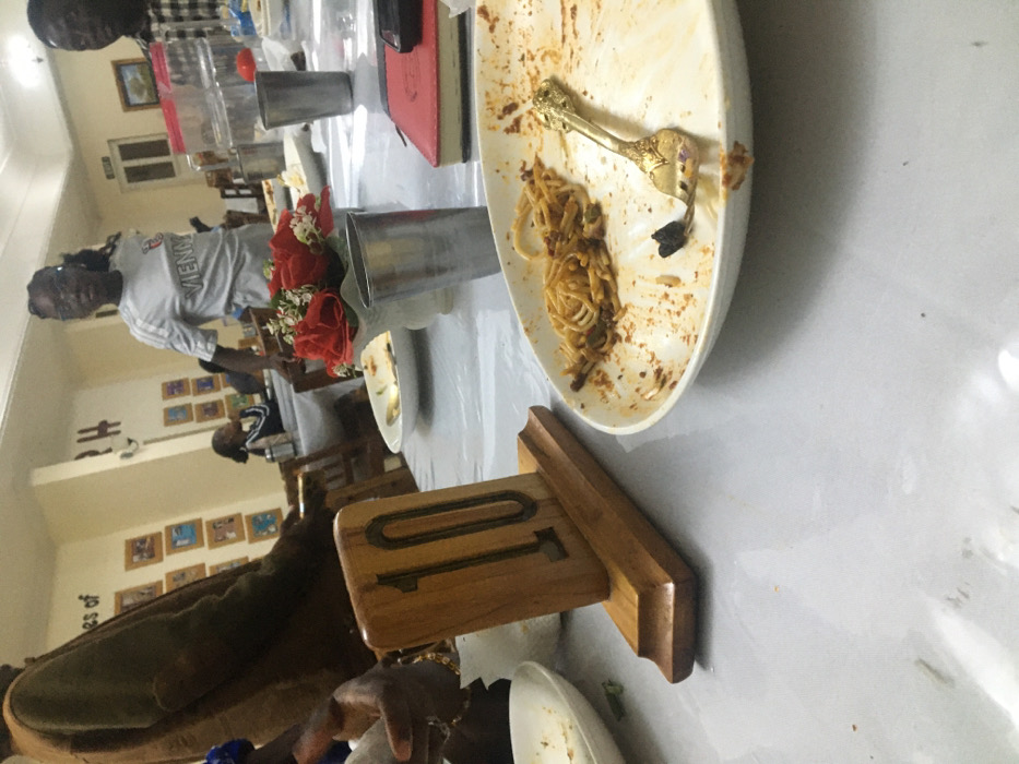 A long table is set for a meal, partially cleared. Dirty plates with leftover spaghetti and silverware are visible. Decorations include flowers, silver cups, and table numbers, with "10" prominent. People are seated, some in white shirts, and the room has framed pictures on the wall. The overall scene suggests a gathering, possibly a formal dinner that has concluded.