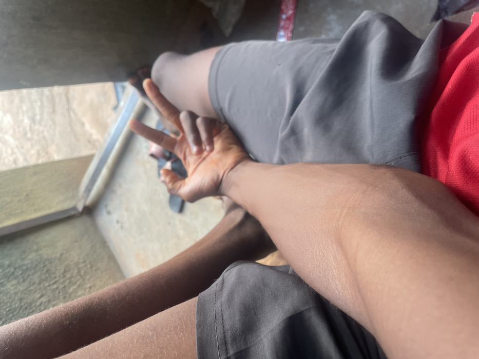 An individual sits with dark grey shorts and a red shirt. Their arm stretches forward, the hand making a peace sign. A small section of their bare leg is visible, alongside a foot wearing a black sandal. The person appears to be on a set of light colored stairs.