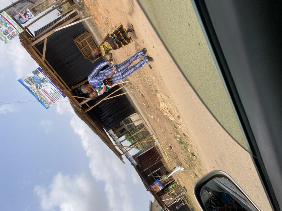 A male individual, dressed in a blue and white patterned traditional Nigerian attire, is observed walking on a dirt road