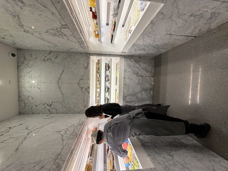 Two people stand in a marble-walled space, examining the contents of refrigerated display cases