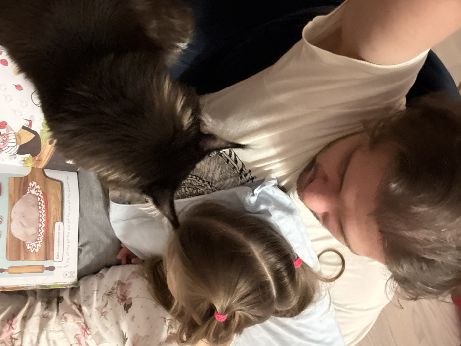 A person lies down with a young child and a black cat. The adult wears a white shirt and appears to be resting their head on the pillow. The child, with blonde hair tied in pigtails, is close to the person. A large, fluffy black cat is near the child's head, partially obscuring a children's book featuring a picture of baked goods. The scene suggests a moment of relaxation or reading time.