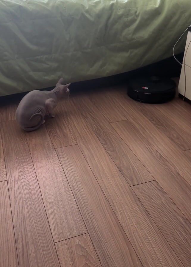 - "A hairless gray cat is sitting on a wooden floor near a bed, looking at a round black robot vacuum cleaner" by FM-zBr6u2, licensed under CC BY 4.0