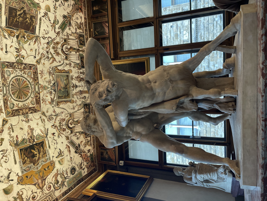 The image displays an interior view of a room within the Palazzo Vecchio in Florence, Italy. Central to the scene is a white marble sculpture depicting a nude, muscular male figure, identified as Hercules, standing and grappling with a struggling centaur, likely Nessus. Hercules, positioned behind the centaur, grips its head with both hands, pulling it backward. The centaur, half-human and half-horse, exhibits a pained expression and appears to be in mid-struggle, its equine legs partially obscured by its human torso. The sculpture rests on a plain white marble base, which is set upon a reddish-brown marble plinth. The room features an ornate, vaulted ceiling adorned with intricate Renaissance grotesque patterns, framed mythological scenes, and decorative elements in muted colors against a light background. Dark-framed paintings, including portraits and dark-toned scenes, are visible on the surrounding walls. To the left, a smaller marble statue of a draped female figure seated on a pedestal is visible. Large, multi-paned wooden windows span the background, offering a view of an exterior building constructed from light-colored, rough-hewn stone blocks, typical of Florentine architecture. A portion of a person's shoulder and arm is visible on the far right edge of the frame.