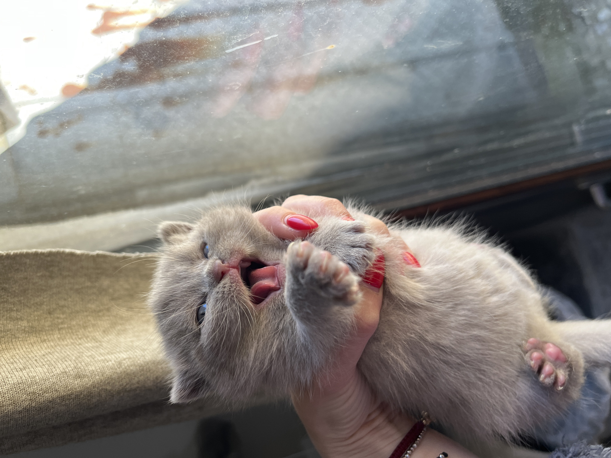 A close-up shot shows a small, light grey kitten held in a person's hand. The kitten is lying on its back, mouth open with its tongue visible, and paws extended upwards. The person's hand has red nail polish. The background includes a blurry window and a light-colored, cushioned surface. The location is not discernible from the image. The city of Kulata, Bulgaria is not apparent from the image.