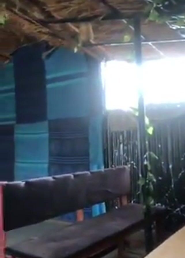 The camera pans from the corner of a wooden table, across a cushioned bench, and upward to a thatched roof, which features some hanging foliage