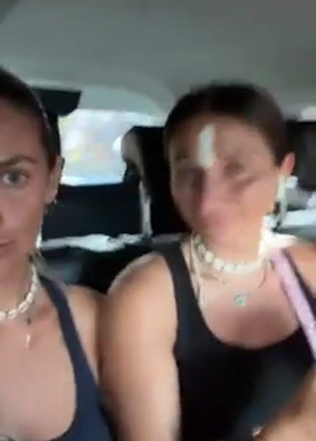 Two women sit in the back of a car. The camera is being held by the woman in the blue top. She has a white stripe on her forehead. They are looking at their phones. They both have necklaces. The other woman has a black top and a pink floral patterned bottom. They are talking.