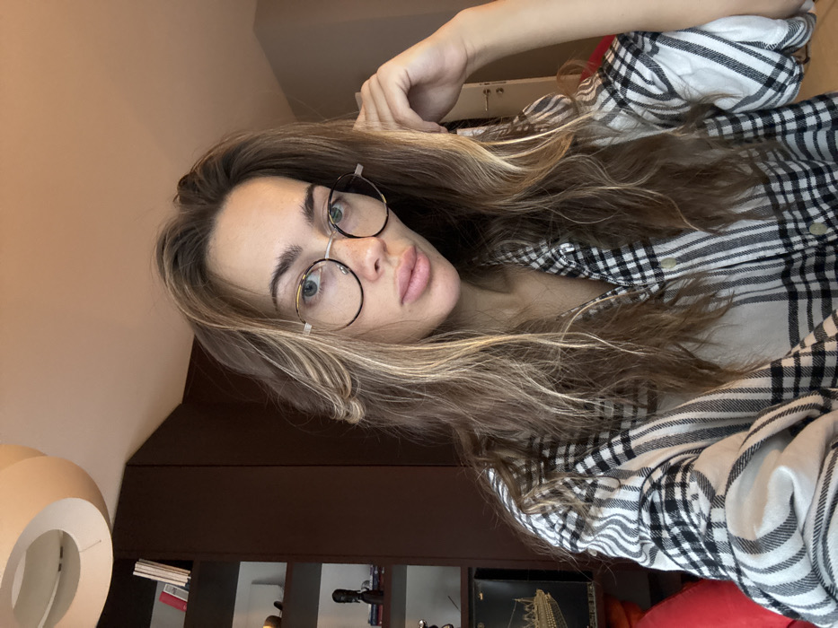 This image depicts a single adult female in an indoor setting, likely a private residence, within the city of Warsaw, Poland. The specific location within Warsaw is not visually discernible. The individual is positioned centrally, looking directly at the camera, indicative of a self-portrait. She possesses long, wavy hair, light brown with blonde highlights, flowing over her shoulders. She wears large, round-rimmed eyeglasses with thin gold-colored frames and dark-patterned upper rims. Her lips are full and slightly parted. She is dressed in a black and white plaid button-up shirt. Her left hand (viewer's left) is raised, with fingers lightly touching the right side of her head near her temple. The background on the left side features a dark brown wooden shelving unit. Visible objects on the shelves include several books, a dark figurine, and a display case containing a detailed model of a ship, notably resembling the RMS Titanic. A portion of a red object, possibly a cushion or upholstery, is visible in the lower left corner. The right side of the background consists of a plain, light-colored wall, with a partially visible door featuring a silver handle. Another hint of red fabric is present behind the subject's right shoulder. In the upper left quadrant, a distinctive, curvilinear, off-white ceiling light fixture is visible.