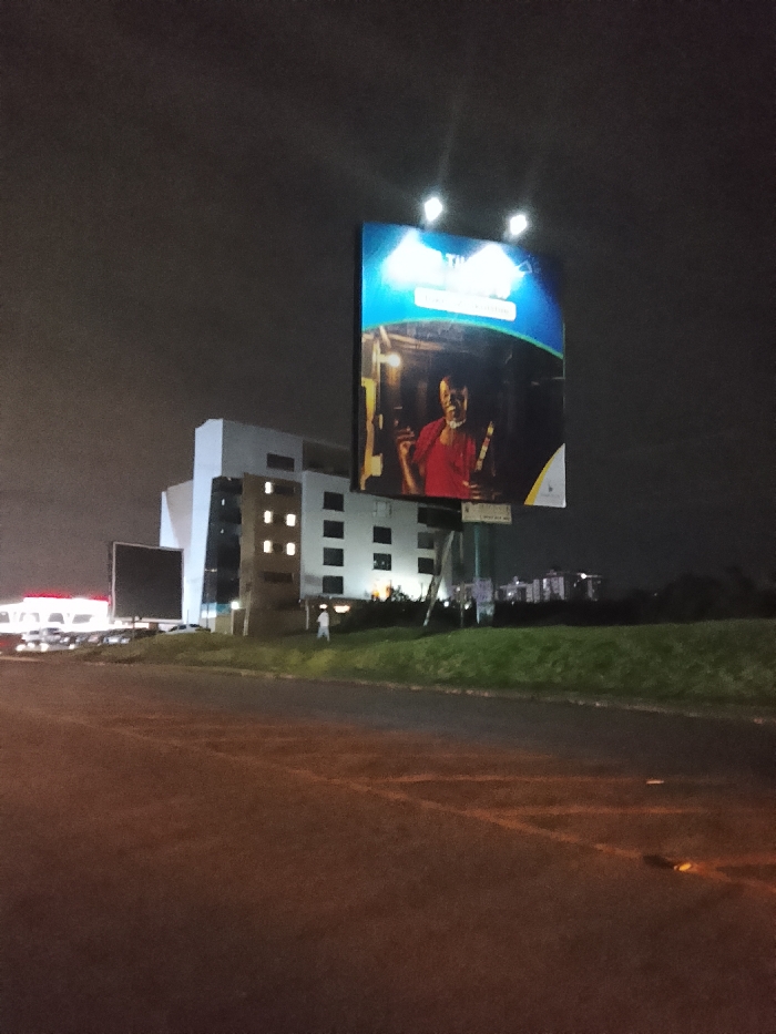 This nighttime image captures a street scene in Kiambu Township ward, Kenya. The foreground consists of a dark asphalt road surface. To the right, an elevated grassy median with green vegetation separates the road from the background structures. In the midground, a prominent, vertically oriented billboard is illuminated by two overhead lights, casting a blueish glow onto its display. The billboard features an advertisement depicting a dark-skinned male figure, possibly older, with a mustache, wearing a red garment. He holds what appears to be a bottle or similar object in his left hand and an elongated object in his right hand. Partial text, including "THE," is visible at the top of the billboard. Behind the grassy median and to the left of the illuminated billboard, a modern, multi-story building stands. It has a light-colored facade with numerous rectangular, dark-framed windows, several of which are illuminated, indicating interior lights. A section of the building to the left features a contemporary glass and angular design. Further to the left, a smaller, dark, unlit rectangular sign or billboard is visible. Beyond this, a series of vehicles are parked, with some distant red and white lights suggesting a commercial establishment or parking area. A single individual, wearing light-colored clothing, is visible walking on the grassy bank in front of the main building, moving towards the right side of the frame. The background consists of a dark, overcast sky, with some indistinct, distant lights and structures on the horizon.