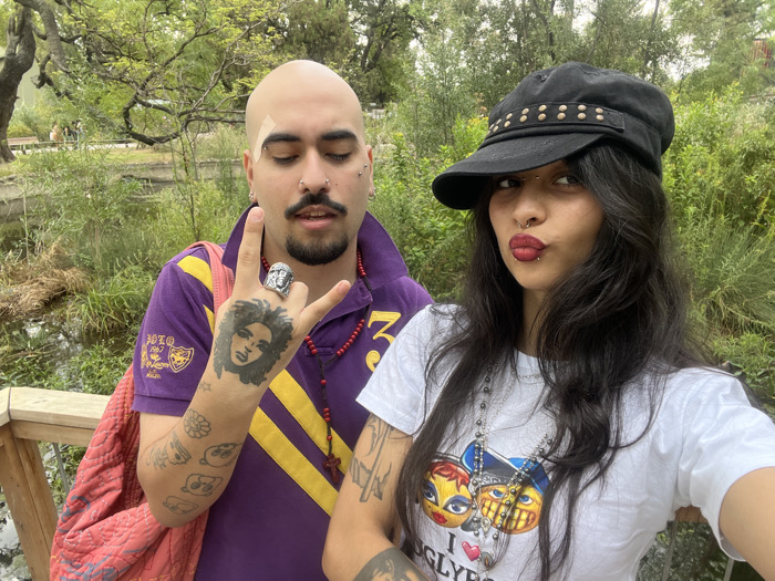 A bald person with multiple piercings and tattoos poses beside a person wearing a studded cap. The first person wears a purple polo with yellow stripes and carries a pink bag. Their hand tattoo features a portrait. The second person wears a white t-shirt with cartoonish graphics and dark lipstick. Both individuals stand outdoors with trees and a small body of water visible in the background.