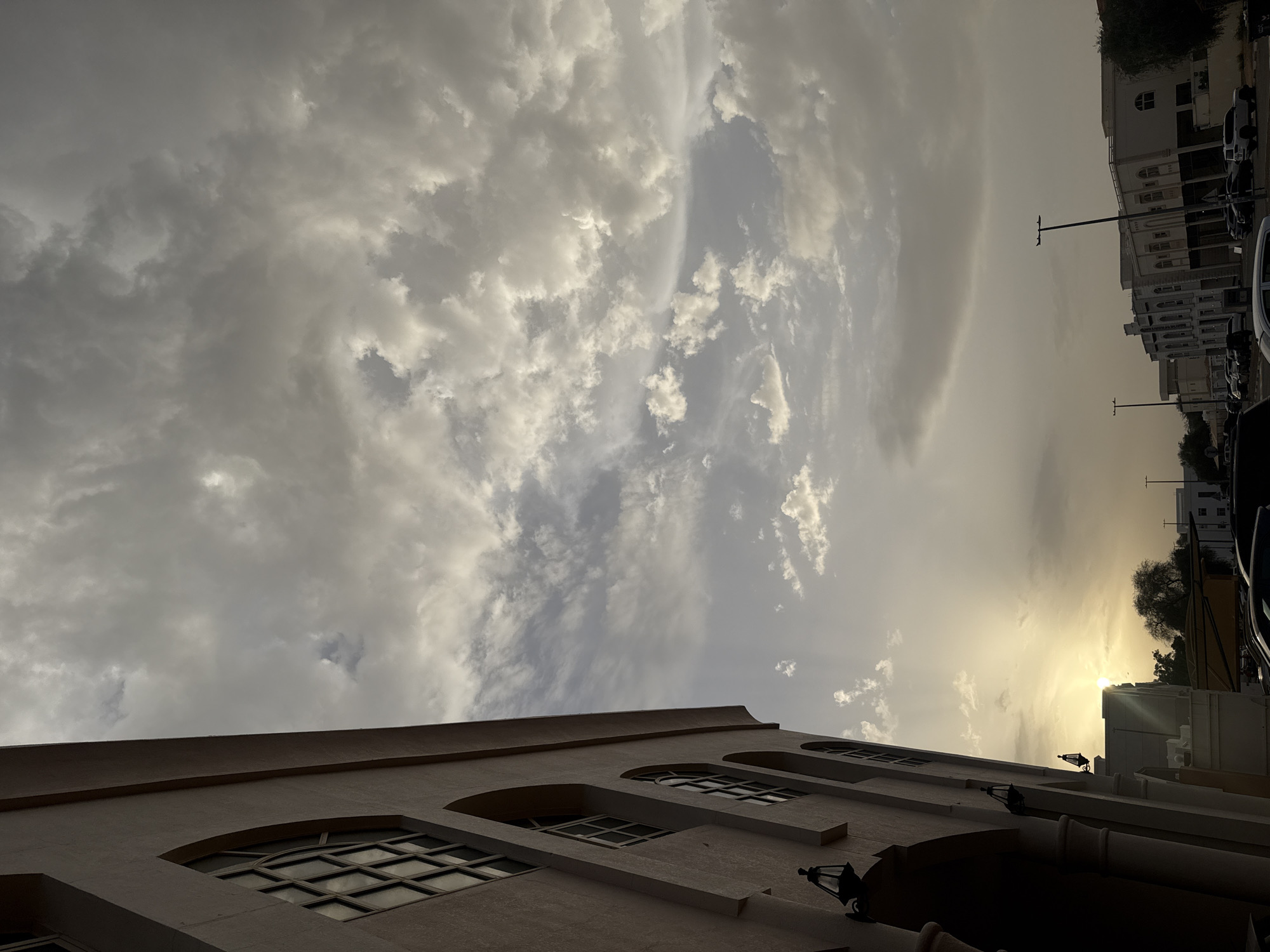 The image presents an outdoor urban scene in Al Jimi, United Arab Emirates, captured during late afternoon or early evening. A light-colored, multi-story building, possibly beige or light brown, dominates the left portion of the frame, featuring multiple arched windows with distinct grid patterns and dark frames. Below the windows, several dark-colored, traditional-style wall-mounted lanterns are affixed. The sky occupies a significant upper and right portion, characterized by a cover of scattered stratocumulus clouds ranging from light grey to white, with patches of lighter sky visible. The sun, positioned low on the horizon towards the lower-left, emits bright yellow-orange rays, partially obscured by a foreground structure. In the midground and background, a paved area with numerous parked vehicles, including cars and a white pickup truck, indicates a street or parking lot. A row of multi-story, light-colored buildings with varied architectural details lines the street on the right. Multiple tall, dark streetlights or utility poles are visible extending above these structures. Sparse trees with dark foliage are present in the background. No individuals are visible, and no specific actions or interactions are depicted.