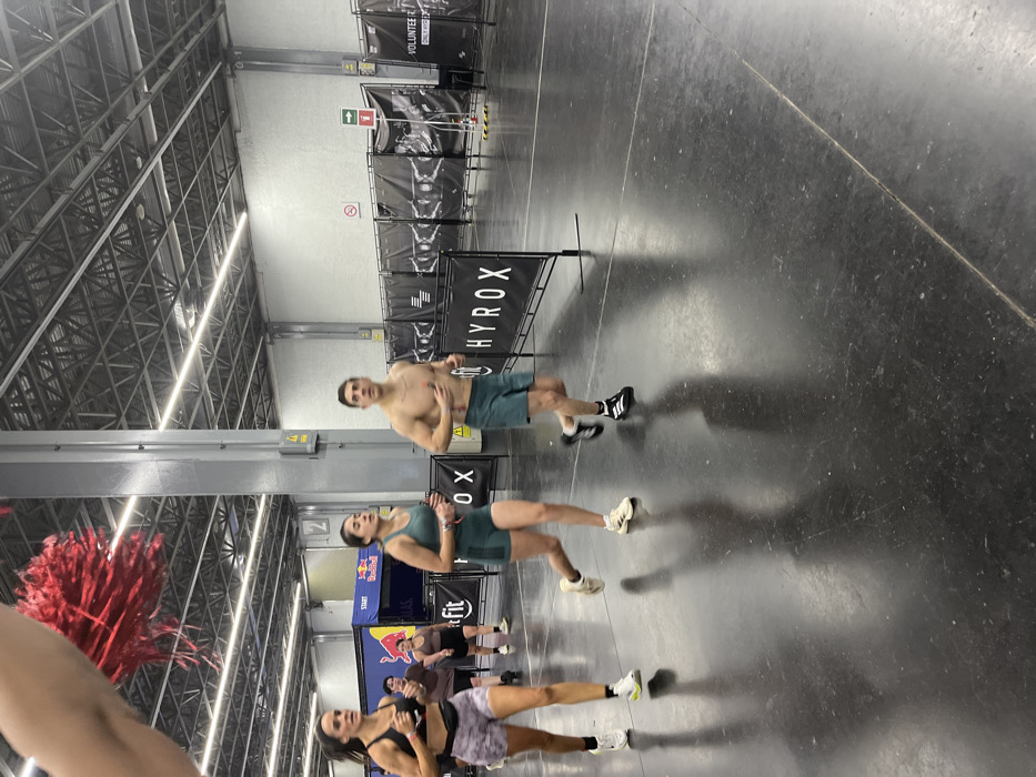 In a large, brightly lit indoor space with a high ceiling, several individuals are engaged in a fitness event. A shirtless man in green shorts runs past a "HYROX" banner. Below him, a woman in green athletic wear performs a squat or lunge, with more athletes behind her. A red pom-pom is partially visible in the foreground. The event appears structured, possibly a competition. The floor is dark and reflective.