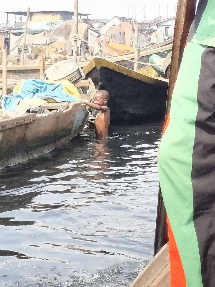 The image depicts a waterside scene in Iwaya, Nigeria. In the midground, a young, shirtless male child, approximately 4-7 years old, stands in dark water up to his lower chest, holding onto the weathered wooden hull of a boat with his right hand. This boat contains folded blue and yellow fabric. To its left, another wooden boat with a visible "YAMAHA" outboard motor is docked. A large, dark-hulled wooden boat with a yellow trim is partially visible to the child's right. The water surface exhibits ripples. In the background, a dense cluster of rudimentary structures, including shacks and various buildings constructed from wood, corrugated metal, and fabric, line the distant shoreline. Numerous other wooden boats are scattered throughout the background. The foreground on the right shows a partial view of what appears to be striped fabric (green, orange, black), possibly a person's attire or a boat element. The sky is overcast or hazy.