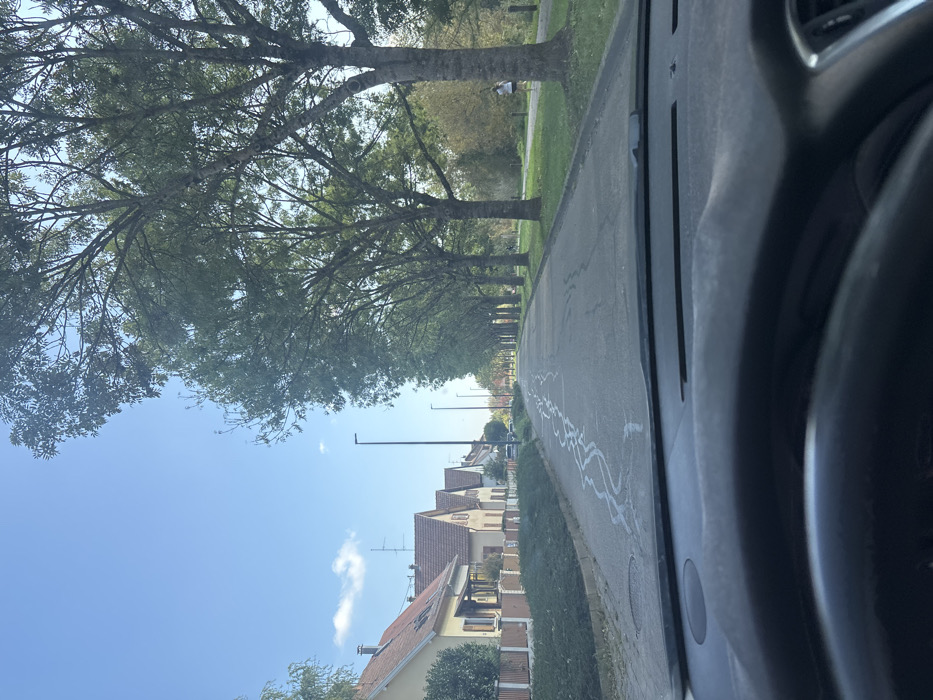 The image displays a daytime street scene from the perspective of a vehicle's dashboard, looking forward down a two-lane asphalt road