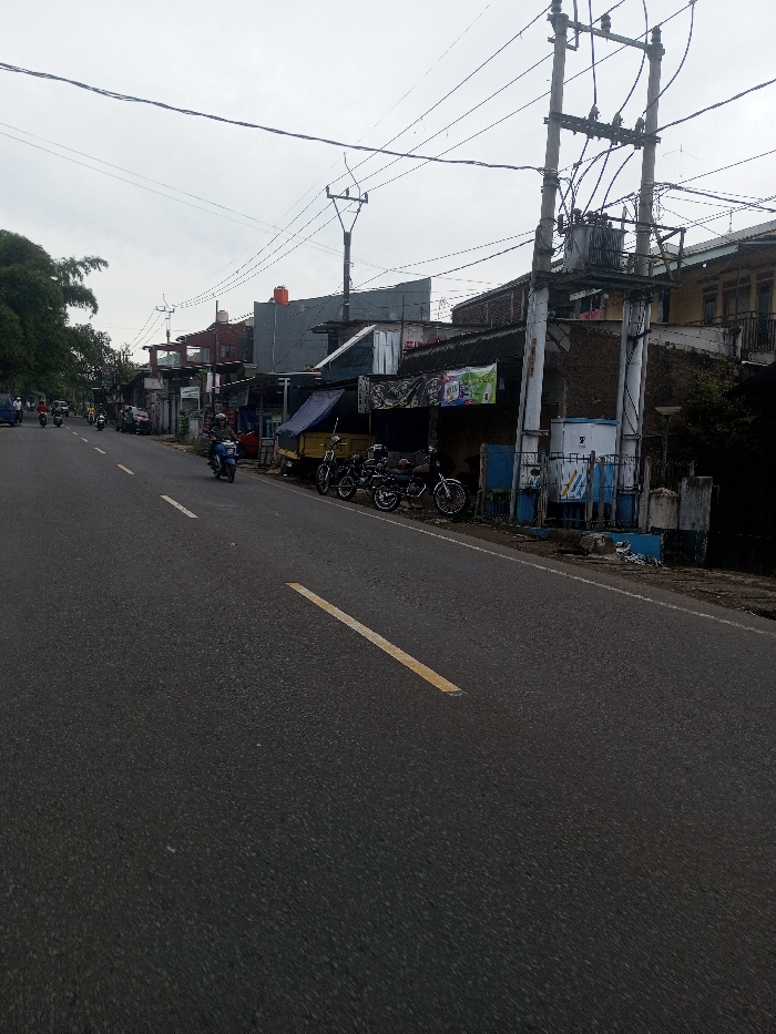 This image depicts a street scene in Sat Thay (East), Myanmar, under an overcast sky. The foreground shows an asphalt road with a single broken yellow lane marker. On the right, a narrow unpaved shoulder borders a continuous row of single and two-story buildings, exhibiting varied architectural styles and materials, some with corrugated roofs and commercial banners. Overhead utility lines are prominent, supported by multiple concrete poles; a double pole structure on the right carries an electrical transformer. Several motorcycles are parked on the right shoulder, adjacent to a light-colored utility vehicle with a yellow bed covered by a blue tarp. Multiple individuals are operating motorcycles on the road, with one person on a blue scooter in the mid-ground traveling away from the camera's perspective. Lush green trees line the left side of the road in the distance.
