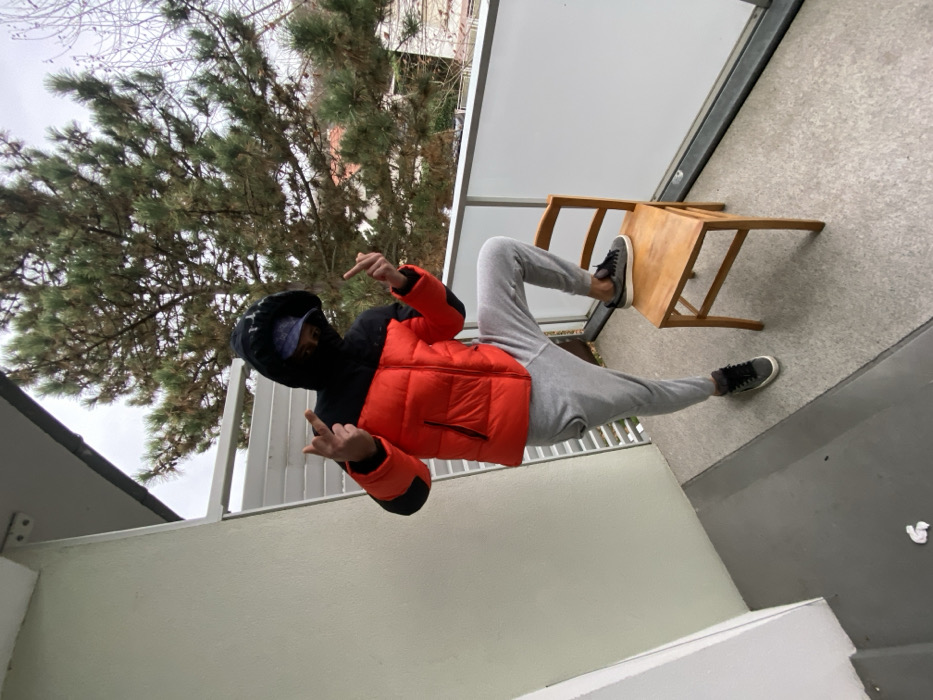 The image displays a single individual on a residential balcony in Strasbourg, France, during daylight hours under an overcast sky. The person's identity is obscured by a black balaclava covering the face, worn beneath a dark blue cap and the hood of a two-tone puffer jacket. The jacket is predominantly bright orange, with black material on the shoulders and hood. The individual wears light grey sweatpants and dark grey sneakers. The person is positioned with their left foot on the darker grey section of the balcony floor, while their right foot is elevated and resting on the seat of a light brown wooden chair with a simple backrest. Both of the individual's hands are raised to chest height, with the middle fingers extended upwards. The balcony features a light-colored wall to the left of the individual. To the right, a railing composed of white horizontal elements and clear or frosted glass panels overlooks an outdoor environment. A large evergreen tree with dense green foliage occupies the mid-ground, and bare tree branches are visible further to the right against the grey sky. An overhang structure is visible in the upper left of the frame.