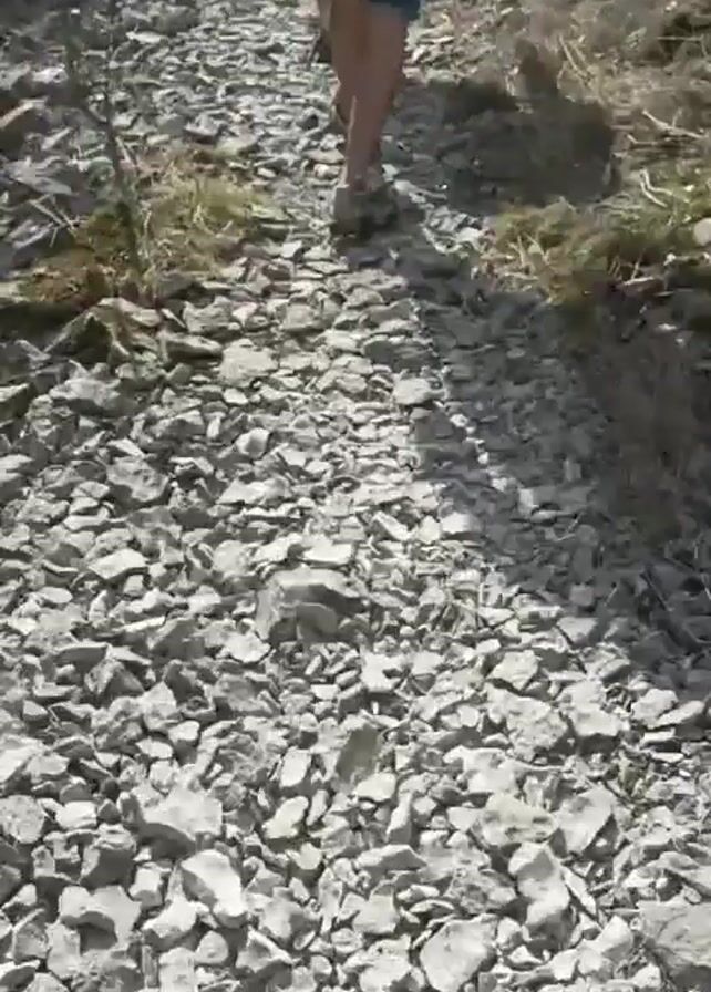 two people walking on a rocky path toward a large cliff. The path is covered in small, gray rocks and there are a few small trees and bushes along the sides. The cliff is made of light-colored rock and is very tall. The sky is blue and there are a few clouds. The camera follows the two people as they walk toward the cliff.