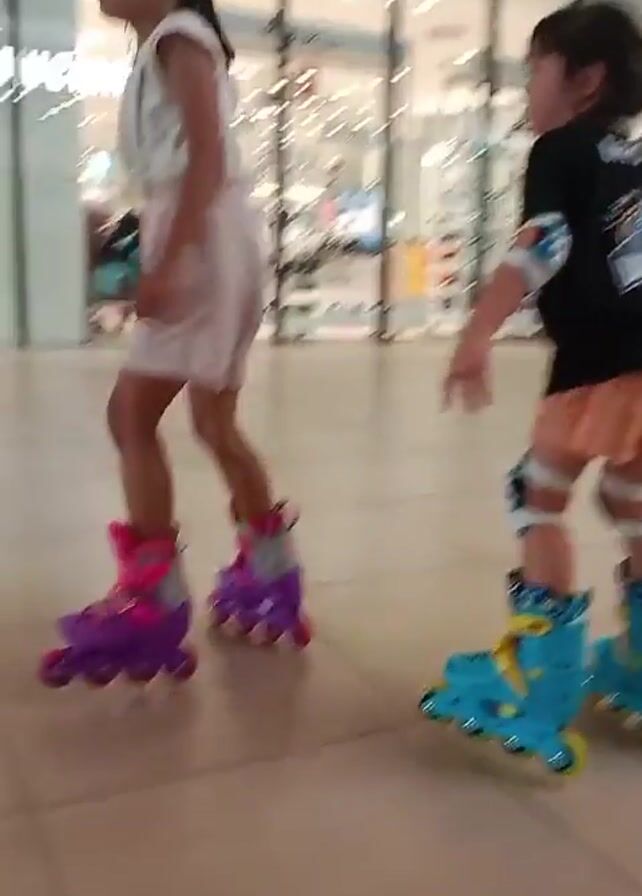 Two young girls are roller skating in a large indoor space with tiled flooring. The girl in the foreground wears a black t-shirt, orange plaid shorts, and blue roller skates with white protective gear on her elbows and knees. She skates with her arms outstretched for balance. The other girl is wearing a light pink outfit and purple roller skates. They are skating side-by-side, close enough to touch hands. Large glass windows and storefronts are visible in the background. People can be seen walking and sitting nearby. The space is well-lit and appears to be a mall or shopping center.