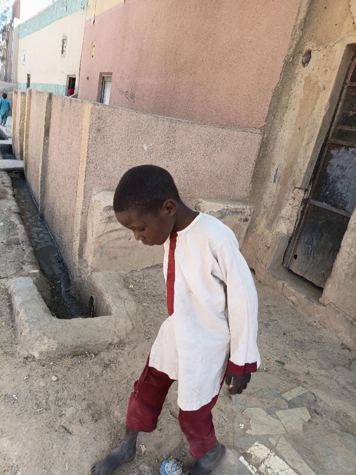 The image captures a scene in Zango, Nigeria, featuring a young male child standing on an uneven, dusty dirt path. The child, with dark skin and closely cropped hair, is positioned slightly right of center, looking downwards and to his left. He wears a loose-fitting, long-sleeved, off-white tunic with red trim along the front opening and cuffs, over dark reddish-brown trousers. His feet are bare and appear dark. A small, light blue and white object, possibly a ball, is visible near his right foot. To the left of the child, a concrete-lined open drainage channel extends into the foreground, containing dark, stagnant liquid. It runs alongside a low concrete wall, which transitions from light yellow to a rough, grey texture. In the upper left background, another individual in a light blue garment walks away from the camera on an elevated section of the path. The background on the right is dominated by a building with a textured, reddish-brown stucco facade, displaying some markings on its surface. Adjacent to this, a section of a lighter, rough-textured wall features a dark, dilapidated door or window frame. Further into the distance, other buildings with pastel-colored exteriors (light blue, cream) are visible under clear daylight.