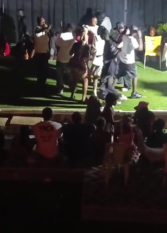 At night, a group of people is gathered outside in what appears to be a backyard. Some are on an elevated, grassy platform, dancing to music coming from a microphone held by one of them. The dancers are of various ages and are wearing different styles of clothing, from casual to dressier outfits. Below the platform, a smaller group is seated in chairs, watching the performance. The area is illuminated by artificial lights, and a fence is visible in the background. Overall, the atmosphere suggests a casual, lively social gathering.