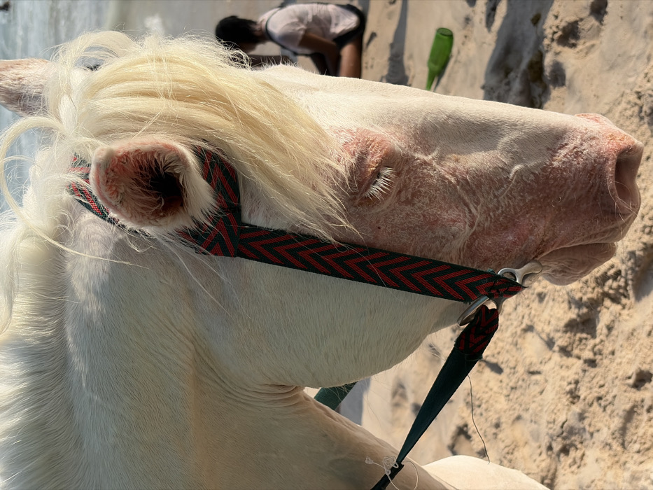 A white horse is depicted in a close-up, partial profile on a sandy beach in Mopo Onijebu, Nigeria. The horse's head, featuring a light mane and forelock, is fitted with a halter comprising a dark green strap with red zigzag patterns and an additional plain dark green strap. Its facial skin, particularly around the muzzle and the closed right eye, exhibits a reddened, textured appearance. In the blurred mid-background, a solitary individual is seated on the sand, wearing a light-colored top and dark bottoms. A green glass bottle lies horizontally on the sand behind the horse's head. The environment consists of light brown sand leading to a blurred body of water in the distant background, under bright daylight.