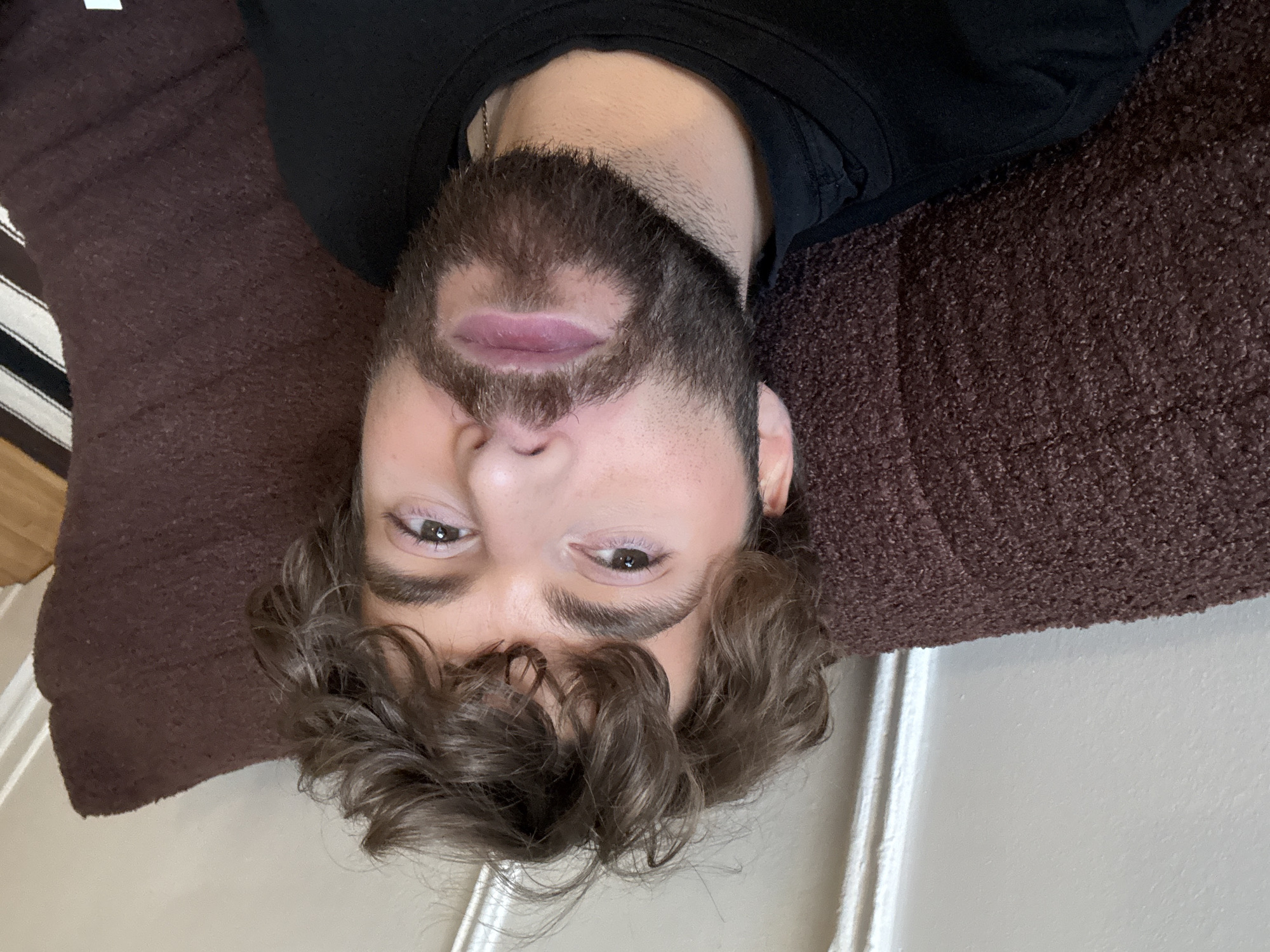 A man lies on a brown pillow, his head tilted upside down in the frame. He has brown hair and a beard. He is wearing a black shirt. The background is a white wall with white trim. The location cannot be determined from the image.