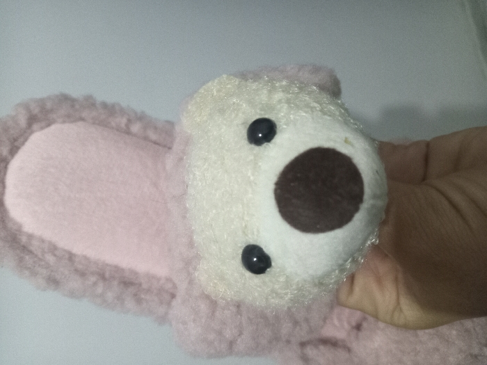 A stuffed, light purple bear with fluffy trim and a pink ear panel is held by a hand. The bear's face is off-white and fuzzy, featuring small, shiny black eyes and a large, round brown nose. The background is a smooth, light surface. The image is a close-up, emphasizing the texture and details of the bear's face and ear.