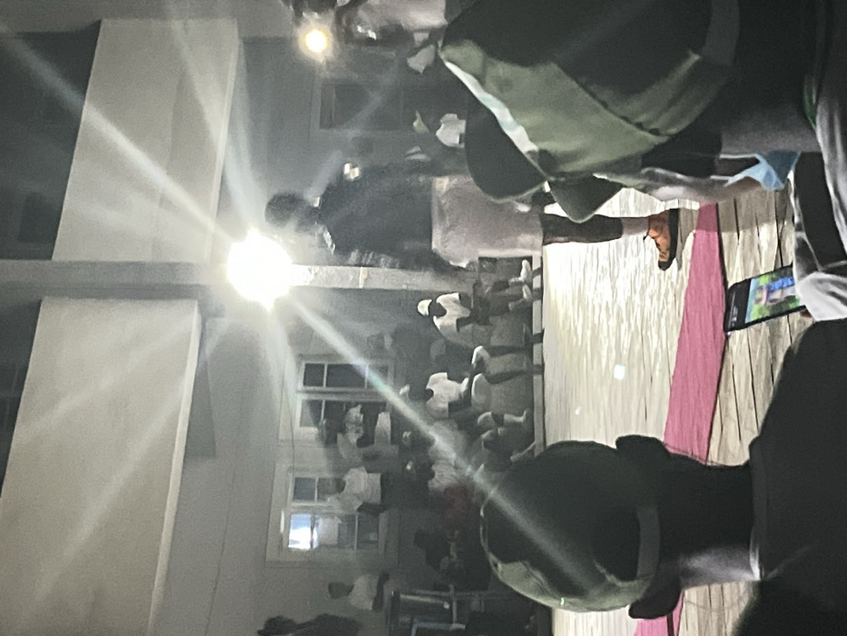 A dimly lit outdoor scene features a group of people. Many are seated, wearing white tops and dark bottoms. Two standing individuals frame the image foreground. One holds a phone displaying a vibrant scene. A bright light source, possibly a spotlight, causes significant glare, illuminating the facade of a building with visible windows in the background. A pink strip of fabric lies on the ground. The overall atmosphere appears to be lively, likely an event or gathering.