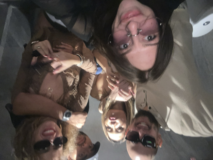 A group of five people pose closely together, looking down at the camera. A woman with sunglasses and curly hair wears a brown blouse with a watch. Another woman has blonde hair. One woman has dark hair and glasses with a nose ring. Two men are in the photo, one wearing a collared shirt and sunglasses, the other in a cap. They are standing close to one another. The photo appears to be taken indoors.